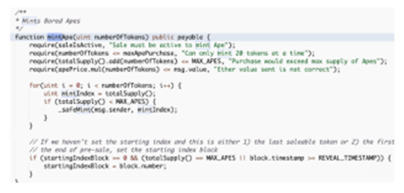 Every NFT collection is based on a smart contract. In the case of Bored Apes, for example, their Smart Contract minting function says: